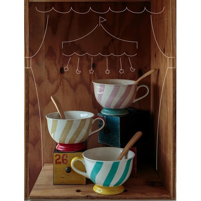 どこかレトロな雰囲気を感じるゴーランドマグ。 遊園地の乗り物、「メリーゴーランド」のような遊び心のあるデザイン。 水や汚れが染み込みにくく扱いやすいストーンウェアのマグカップと、天然木の温かみや自然な風合いを感じられるスプーンの2点セット。 ホリデーシーズンのプレゼントにもおすすめです。 サイズ マグ:約Φ11.5×H7.5cm スプーン:約L16cm 素材・成分 マグ:ストーンウェア スプーン:天然木 原産国 タイ 使用方法 食器洗浄機:〇 レンジ:〇 オーブン:×(マグのみ) その他 注意事項 ※ひとつひとつ手作業で絵付けをしているため、色の濃淡、刷毛目などの多少の個体差がみられます。