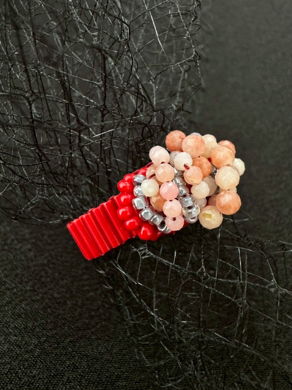 ビビッドな赤と、ピンクオパールの優しいピンクを合わせたボリューミーなカラー。