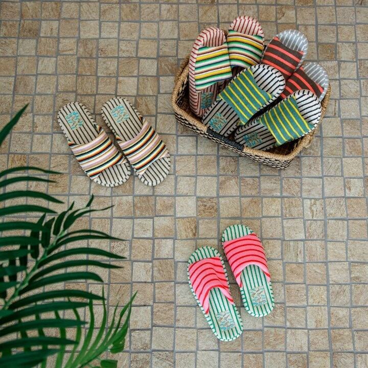 絶妙なカラーバランスのしましま生地のアッパーとインソールを組み合わせた、カジュアルでポップなデザインのスリッパ。