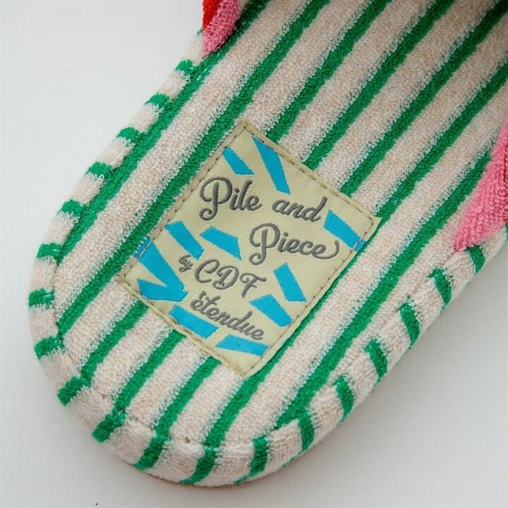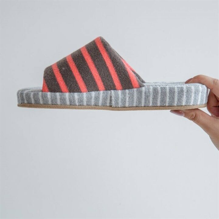 絶妙なカラーバランスのしましま生地のアッパーとインソールを組み合わせた、カジュアルでポップなデザインのスリッパ。